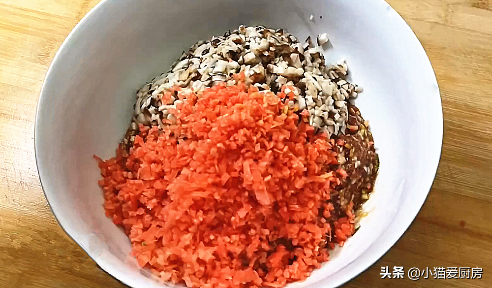 【步骤五】:把香菇放入开水锅中焯水10秒钟,用以去除异味,然后捞出来用凉水泡凉后,把水挤干后,切成末;同样把胡萝卜也切成小颗粒;然后把它们分别放入肉馅中,但是不要和,等包饺子的时候再和。
