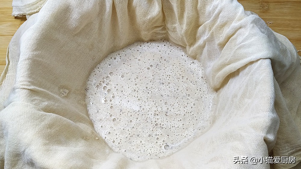 (2)豆浆要多放几纱布过滤,这样的豆浆会更加细腻,做出的豆腐脑也细腻有弹性,口感也比较好。