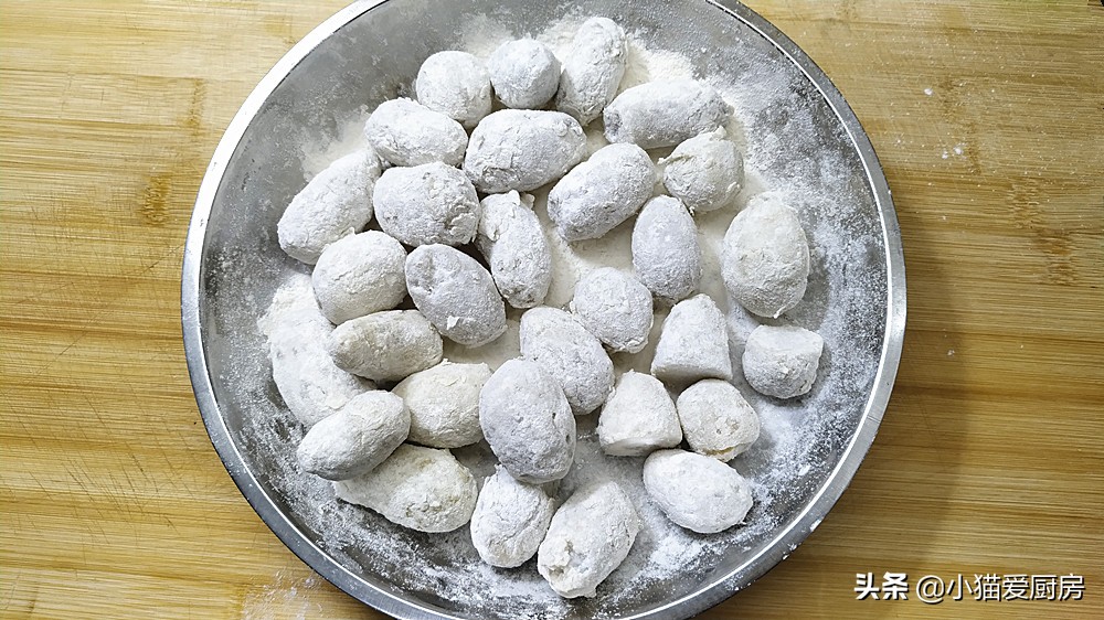 【步骤六】:把扒完皮的芋头放盘子中,放入50克左右的面粉,然后用手颠簸盘子,让芋头都裹上面粉。
