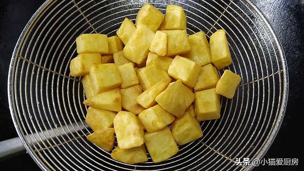 【步骤七】:然后把土豆也倒油里边,炸成金黄色,炸熟后捞出把油沥干备用。