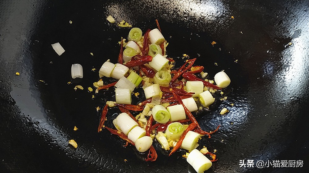 【步骤五】:热锅倒油,放入姜蒜和泡过水的红辣椒,开小火炒出香味后,放入大葱段,简单翻炒几下就可以。