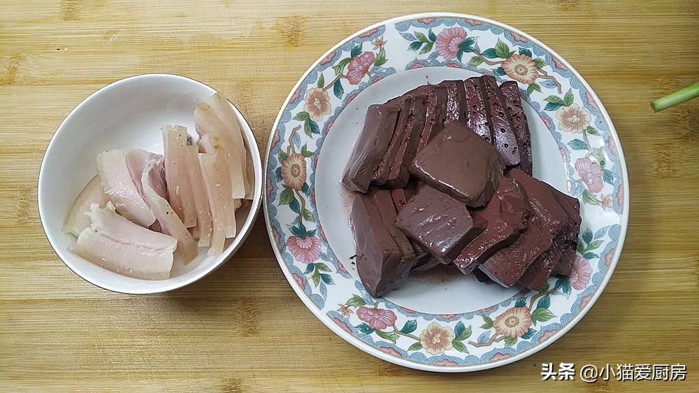 【步骤一】:将猪血用清水清洗几遍,然后再切成半厘米厚长宽2-3厘米的小块,也可以切成方块,反正怎么顺手怎么做;同时把煮熟的五花肉切成片,厚度1毫米左右也就是差不多2个硬币厚备用。
