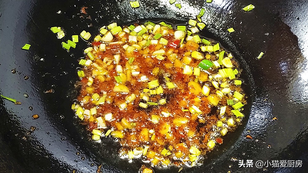 【步骤三】:锅里放一勺油,油热放入葱姜蒜粒,开小火炒出香味,然后放一勺豆瓣酱,炒出红油和香味。