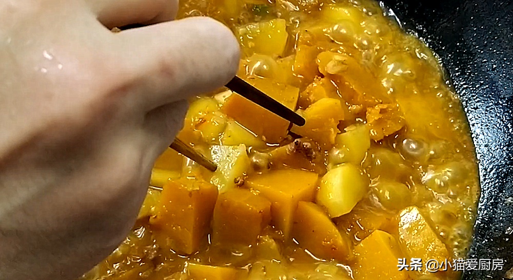(2)南瓜和土豆要先炒一下,把它们的水汽炒掉,炖出来才香。