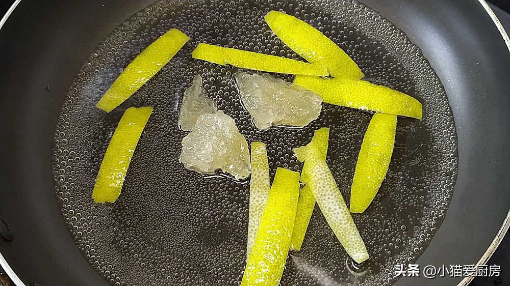 (2)熬煮冰糖的柠檬皮要把里边的白色的囊去掉,因为这一次是苦的,如果不去除的话,糖汁会苦的,熬煮用中小火,时间以熬化冰糖为止,冰糖和水的比例是1:2,同时柠檬的籽也要去掉,籽也是苦的。