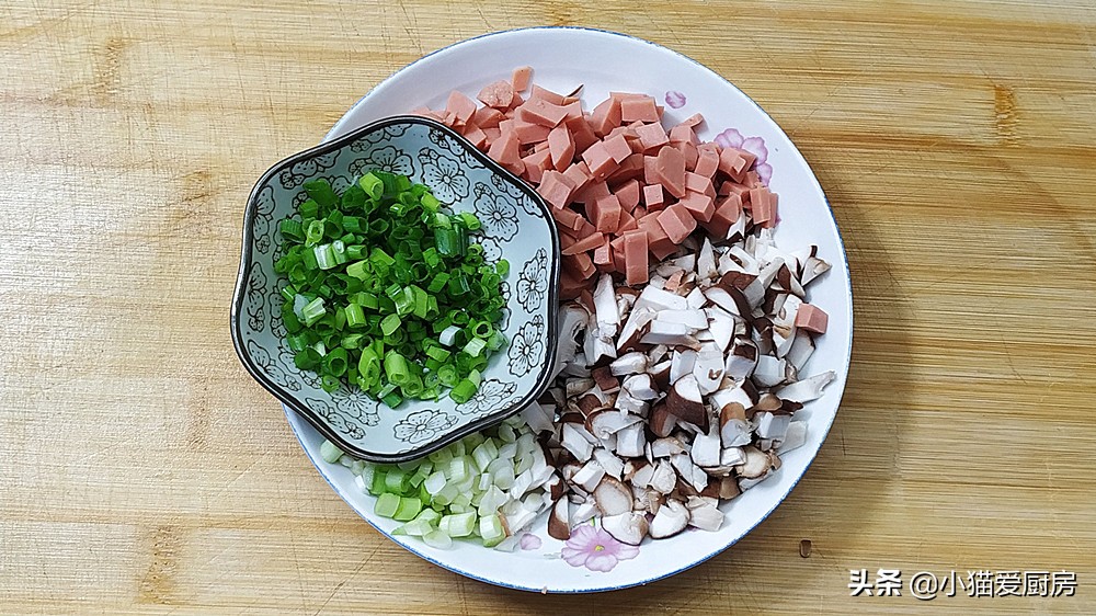【步骤二】:把火腿肠、香菇切成丁,大小和花生粒大就可以,香葱切成末,把葱白和葱叶分开放,大蒜去皮拍碎剁成末,然后把它们分别装盘备用。