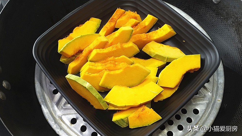 【步骤二】:把南瓜去皮,给它切成片放入盘子中,上锅隔水蒸8分钟,要用中火哈!