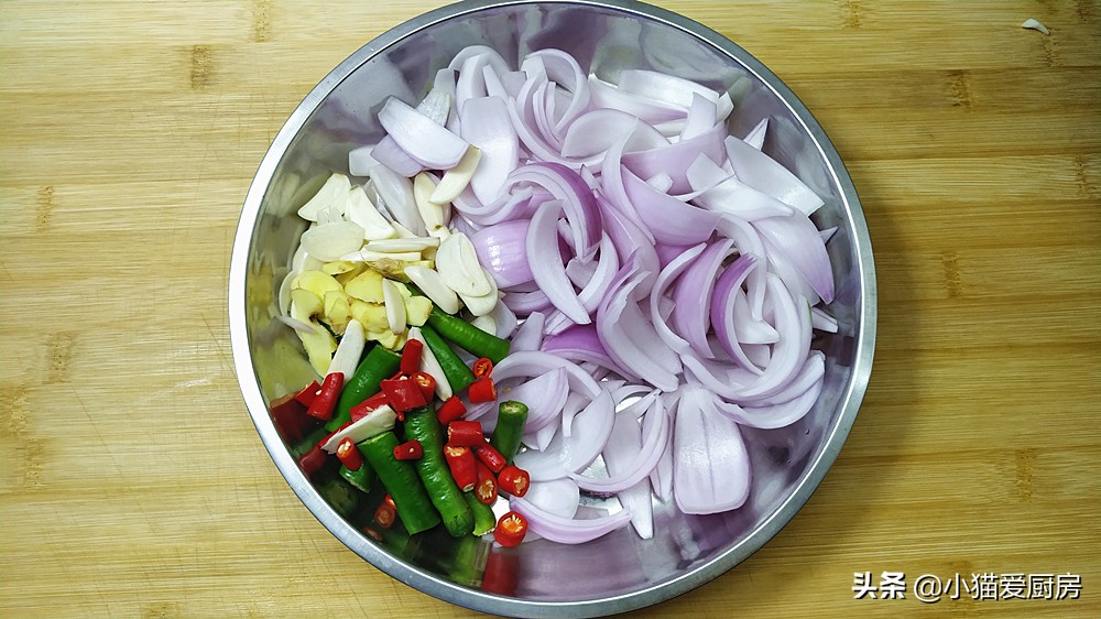 【步骤二】:先把洋葱外面的干皮去掉,用清水冲洗干净,把两头都切一下,把洋葱切条或者块都可以,我是切的条;把生姜和大蒜都切成片备用,同时把尖椒洗净切成寸段,小米辣切成小段;把它们分别装盘备用(要注意的是这些材料都要把水晾干)。