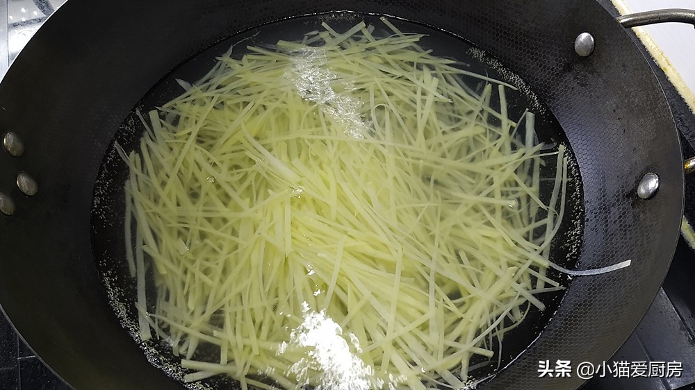 (3)土豆丝焯水不要过火,一般6成熟就可以,也就1分钟左右,焯水过火的话,土豆丝就不会脆爽了,焯完水后放入凉水中过水也是为了不让土豆丝过火。