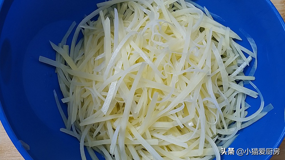 嗨@大家好!我是“小猫爱厨房”的小猫,有很长时间没有吃过土豆了,今天早上孩子上学突然说想吃土豆丝。我突然想起我家神兽是最喜欢吃的菜,基本上每个礼拜都会做两次,由于最近忙,把她的喜好吃土豆丝给忘了。可能是从小就养成的习惯吧!孩子和我一样特别爱吃土豆,怎么也吃不腻,就是天天做来吃也觉得很好吃。所以我就经常变换着花样做给她吃,如炒土豆、烧土豆、凉拌土豆丝等等都尝试着做。今天孩子点名要吃土豆丝,所以我准备做她最爱吃的“鱼香土豆丝”来吃。