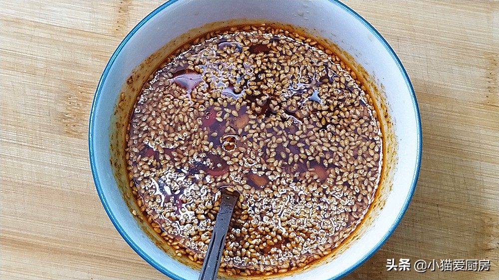 【步骤五】:锅中放一勺油烧热,把油分三次浇到准备好的调料碗中,把调料的香味激发出来后,然后依次放入生抽5克、白糖2克、盐2克、香醋3克、鸡精2克搅拌均匀备用。