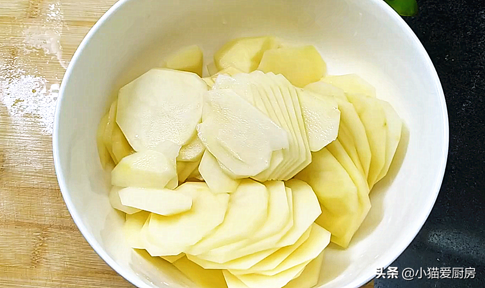 (1)土豆片不要切得太薄,太薄煮的时候易碎,容易混汤,一般2毫米或者比硬币稍微厚点就可以。切成片以后,要是不马上做的话,一定要用清水泡上,分钟土豆氧化变黑(土豆的淀粉遇到空气中的氧气会发生反应)。