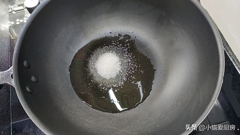 【步骤四】:锅中放入20克左右的油,然后放入20克白糖,开小火给它熬化,当糖变成小泡沫后,倒入适量热水(凉水的话由于锅温度比较高,对锅不好,同时容易沸腾伤到人)。