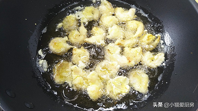 【步骤七】:然后我们把虾虾仁放入面糊里边充分挂上面糊,然后逐个放入油锅中开始炸(注意一定要开小火)。