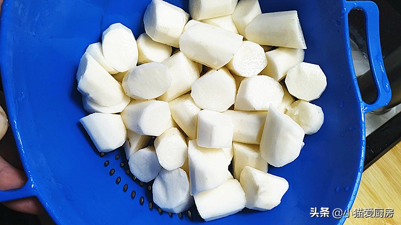 【步骤一】:带上胶皮手套,然后用刀把山药的皮削掉,切成滚刀块,在放入碗中,添清水后放一勺盐泡10分钟左右(主要是防止山药变黑和继续流出黏液)。