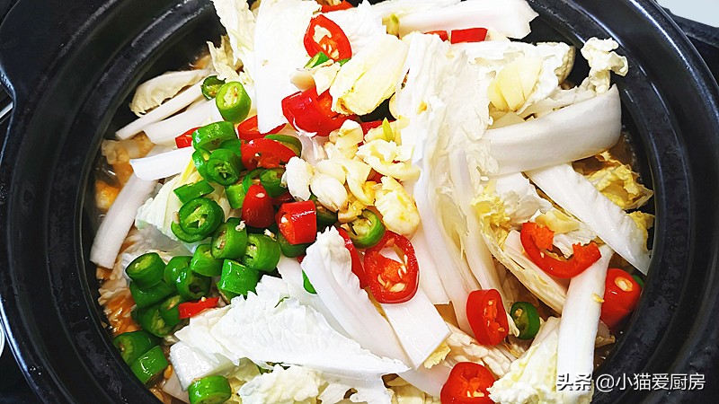 【步骤八】:我们开小火焖制15分钟左右,倒入白菜、青红辣椒圈和大蒜放鸡精2克搅拌一下,然后煮3分钟左右。