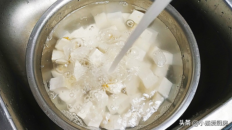 【步骤二】:把切完的香芋块放入盆中,放清水,在放一勺盐清泡10分钟左右。这样可以防止芋头的黏液流出。