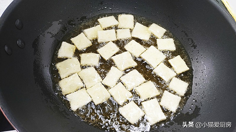 【步骤七】:锅中放入300克左右的油烧至5成热后,开中火然后把切好的小面块一块一块地放锅中开炸,中间要不停地搅动,炸定型后捞出。然后把油加热至9成热,然后把锅巴放入锅中重新炸至金黄色捞出来沥干油。