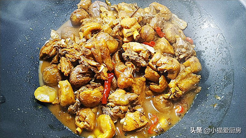 (3)鸡肉切成块后先焯水,要将鸡肉的水汽炒干,同时要把鸡肉的油炒出来后再添水炖,添水一定要80度以上的水,这样炖出的鸡肉吃起来更香。
