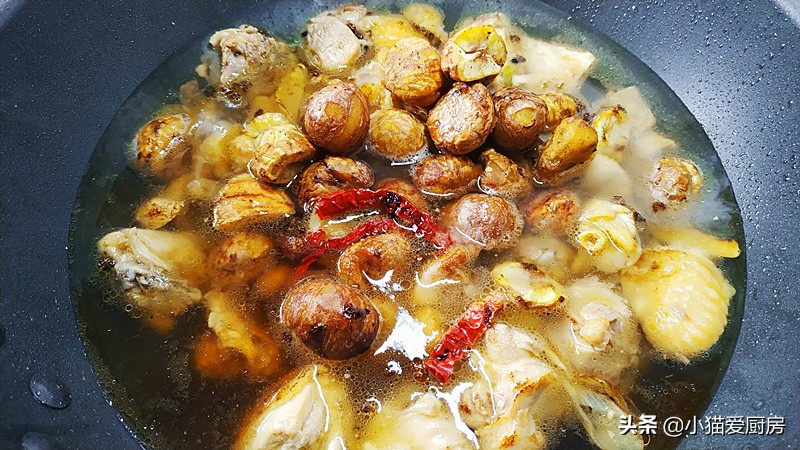 【步骤八】:鸡肉水汽炒干后,继续翻炒至鸡肉开始出油,慢慢变得有点焦黄后,倒入板栗,然后我们添热水(注意一定要热水80度以上,主要是防止鸡肉遇冷水收紧,这样炖出的鸡肉变得不香还影响口感),水以没过鸡肉为准,要是鸡是1年以上的鸡,就要多放水了,多放差不多三分之一的水。