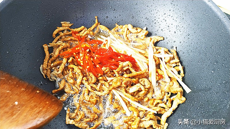 5.然后把炒锅烧热然后放油,同时把肥肉丝倒入开小火把油煸出来,然后倒入瘦肉丝,开小火迅速划散(划散肉丝不要开大火,要是铁锅的话开大火肉丝会沾锅的),然后倒入泡姜和泡辣椒丝。