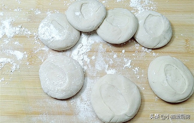 9.这个时候面也醒得差不多了,然后我们取面板,撒上一点面粉,把面团揉一遍,揉成光滑的面团,然后把面团搓成长条,用刀切成大小一样的小块,然后用手团成小面团压成小圆饼。
