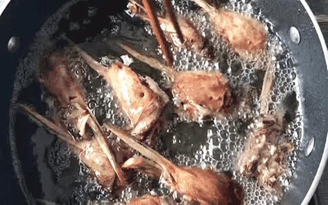 4.锅中放油烧7成热,把腌制好的鸭下巴炸至金黄色捞出备用。
