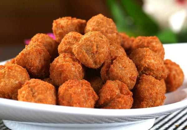 (四)、炒锅放油烧制7分热、然后把腌好的肉馅挤成直径2cm左右的小丸子放入油锅中炸成金黄色捞出沥干油备用。