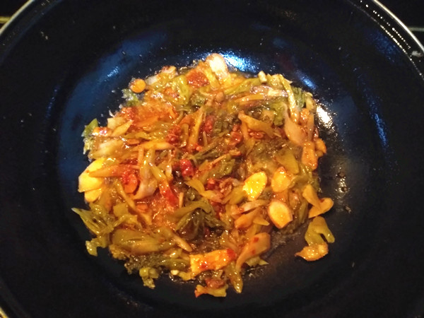 (六)、锅中重新放油烧热、依次放入泡姜、少许蒜末爆香然后加入酸菜和豆瓣酱(可以多放点)继续翻炒。