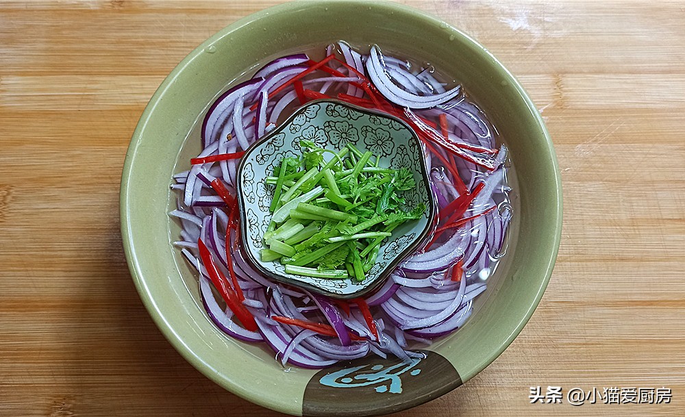 【步骤三】:把洋葱切成丝放入水中,放一勺盐浸泡10分钟,同时把香菜清洗干净,把叶子摘掉不要,把杆切成寸断装盘备用。