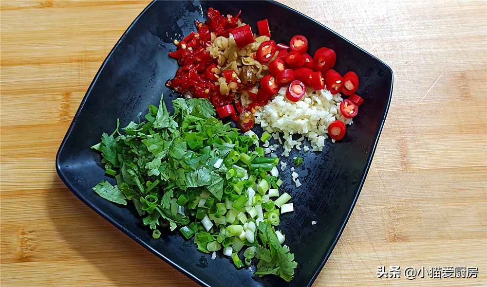 【步骤三】:把大蒜拍碎剁成蒜末、野山椒和泡辣椒切成圈、小米辣也切成圈、香葱和香菜都切成末,然后装盘备用。