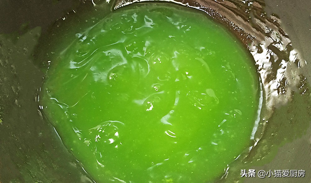 【步骤四】:全部倒完后,持续搅拌中间不要停,主要是是防止糊锅底,一直搅拌到成绿色透明的糊糊状,开始不停的鼓大泡泡就可以了。