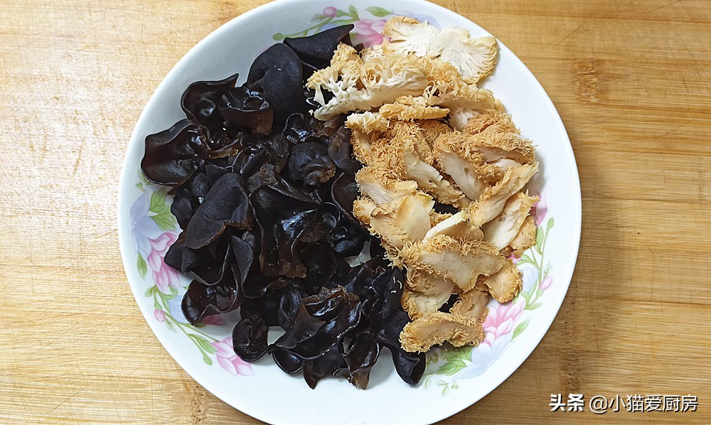 【步骤四】:锅中添水大火烧开,把猴头菇和木耳放入锅中焯水2分钟,然后捞出来把水控干备用。