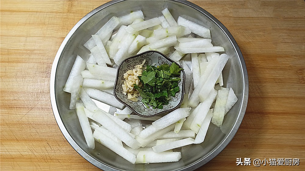 【步骤二】:把冬瓜切成和手指头大小的条,大蒜拍碎剁成蒜末,香菜切成末,然后分别装盘备用。