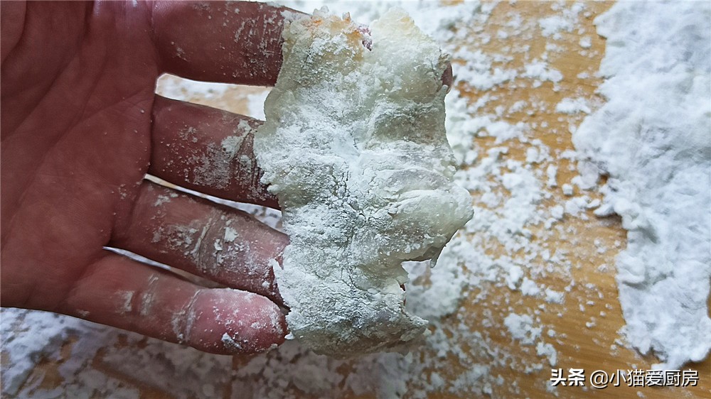 【步骤四】:我们往面板上放一大勺玉米淀粉,然后把破开的虾两边都沾上玉米淀粉,然后用擀面杖把虾敲打成薄片状,然后装盘静置10分钟,让虾的水分把淀粉浸湿。