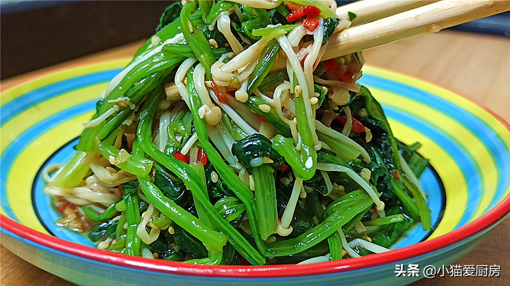 嗨@大家好!我是“小猫爱厨房”的小猫,今天又和大家见面了,分享生活、分享美食、分享快乐!今天小猫给大家带来的是一道适合减肥人士吃的一道凉拌菜:“凉拌菠菜金针菇”,这道菜清香爽口,好吃过瘾,一个人吃一盘,都不会长肉,大家要是喜欢吃菠菜的话,可以试一试这道减肥菜。