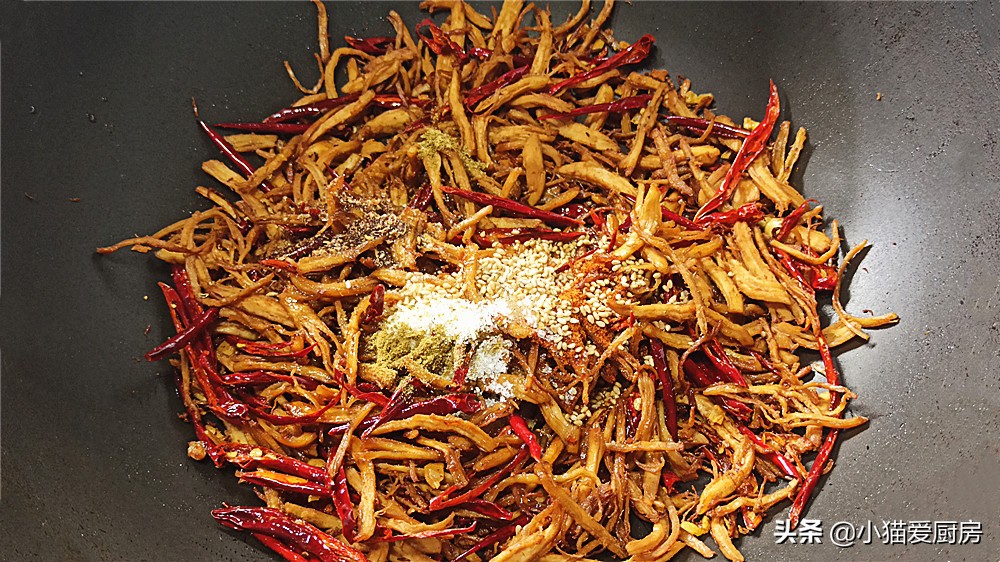 【步骤九】:调料香味炒出来后把鸡丝到里边,同时把准备好的孜然面、辣椒面、花椒面、熟白芝麻、盐、鸡精一起到里边,然后小火继续翻炒均匀。