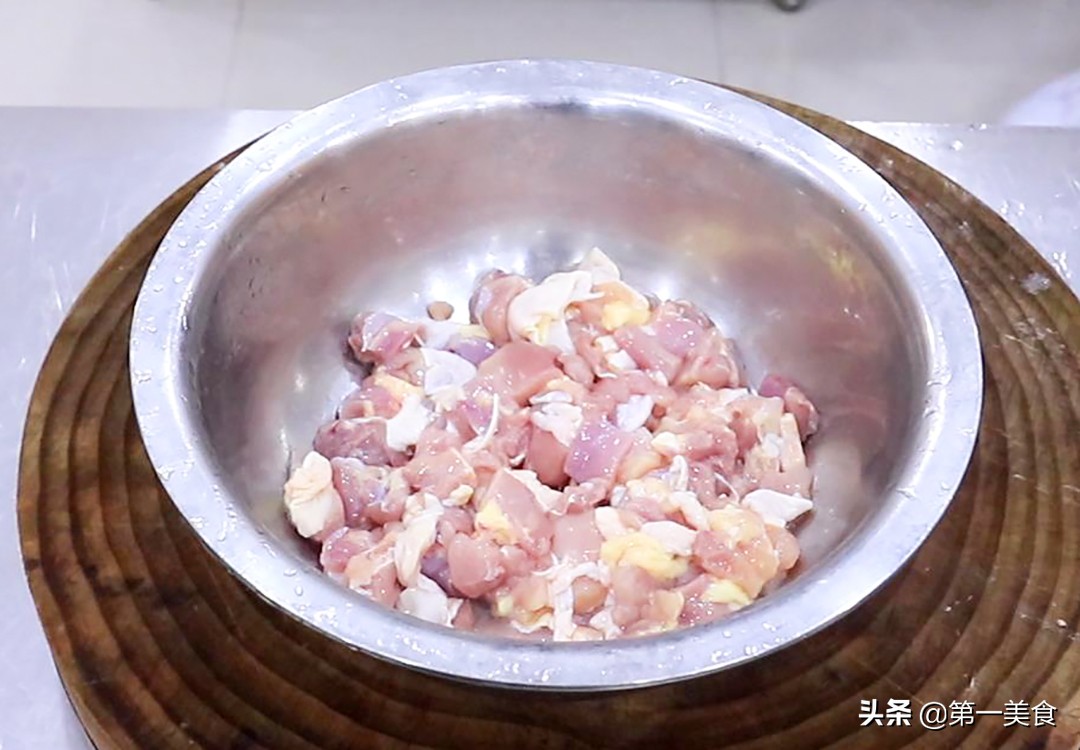 准备鸡腿两个,也可以用鸡胸肉代替,把鸡腿里面的骨头剔出来,鸡肉切成1厘米左右的小丁,鸡皮不用去除,鸡皮的夹层含有鸡油,口感上会更滑嫩。