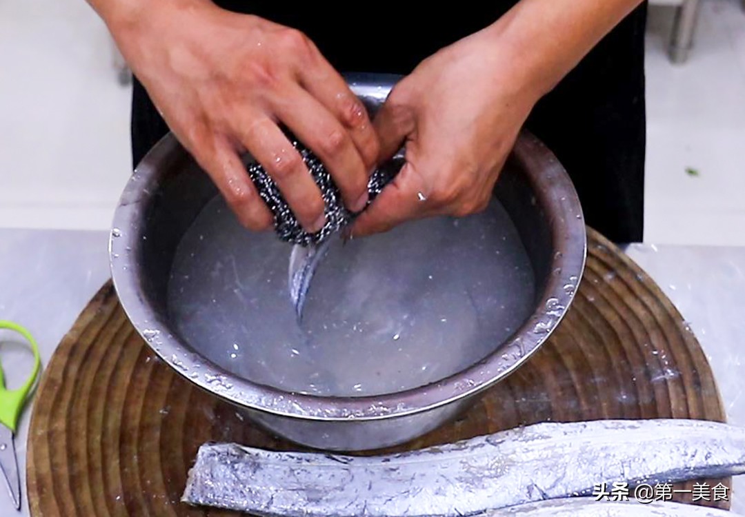准备带鱼3条,先把鱼头剪下来,再剪开鱼肚,去除里面的内脏,带鱼表面的银鳞含有丰富的营养物质可以直接食用,实在不喜欢的话,可以用钢丝球轻轻地刮掉。