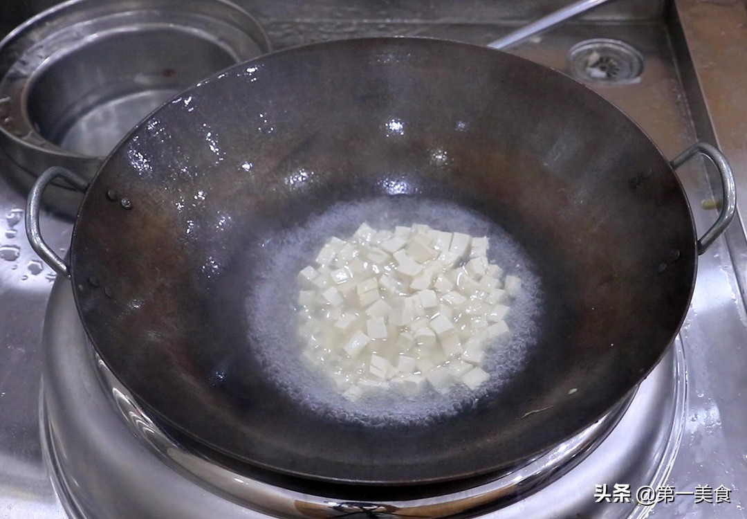 锅内烧水,加入一勺食盐,淡盐水煮出来的豆腐更加紧实不易破碎,把豆腐倒入锅中,焯水一分钟左右,把豆腐倒出来,用清水冲洗干净备用,豆腐焯水主要是为了去除豆腥味。