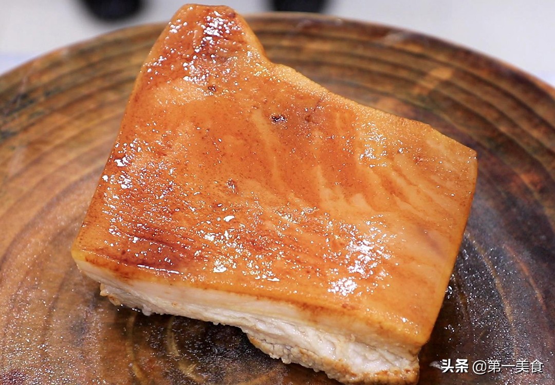 90分钟以后,把五花肉取出来,稍微晾凉一点,先把肉汁倒出来,把五花肉倒扣在盘中,再浇上肉汁撒上葱花,美味即成。