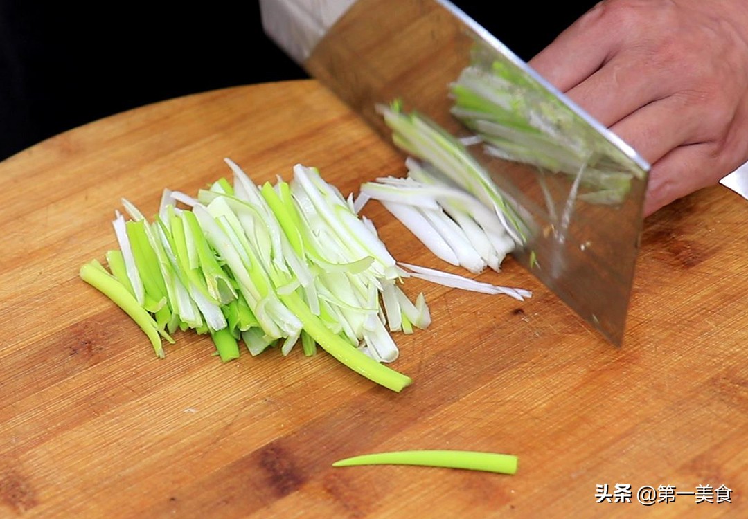 锅内烧油,油温五成热时,抓入一小把花椒,几粒八角,放入切好的葱丝,开小火把香料炸干、炸香,葱丝炸成金黄色时倒出来,沥干料渣备用。