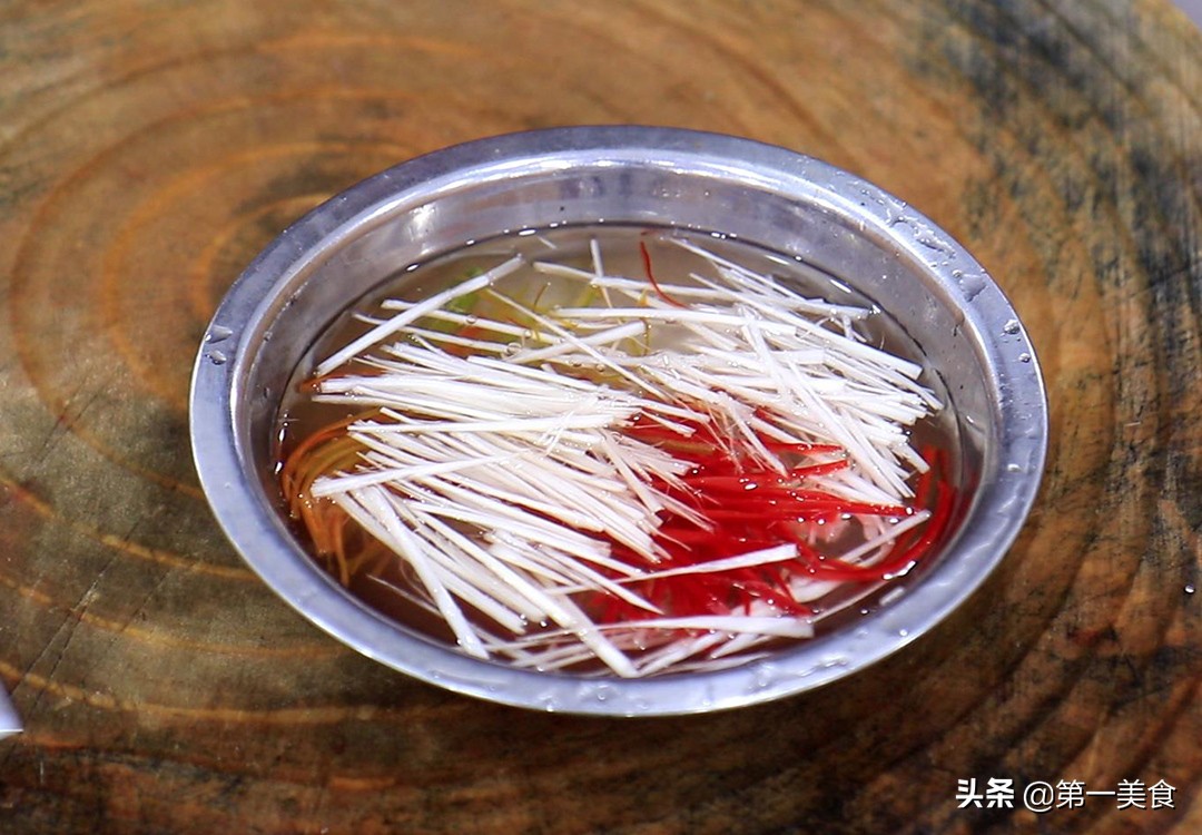 准备适量的葱白,同样切成丝,加入适量的清水浸泡一会儿。