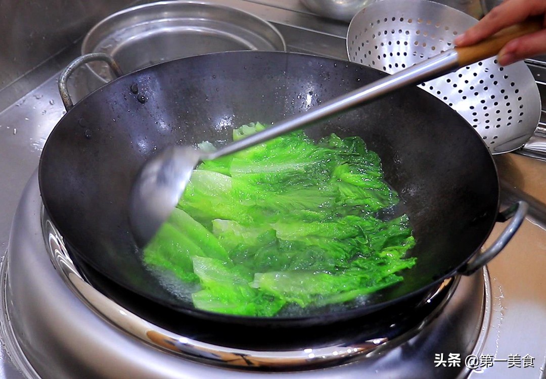 锅内烧水,加入少许植物油和食盐,水烧开以后,把生菜叶放入锅中,时间不要超过10秒钟,生菜烫软、微微烫变色以后倒出来,迅速放在凉开水中过凉,这样能防止生菜变黑,保持生菜清脆的口感,生菜晾凉以后摆放在盘中备用。