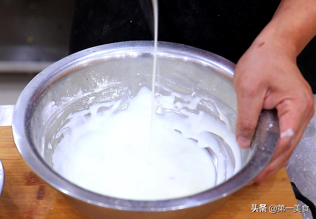 盆中打入两个蛋清,加入一勺食盐,倒入适量的淀粉用手抓匀,淀粉糊的粘稠度能够拉丝即可。