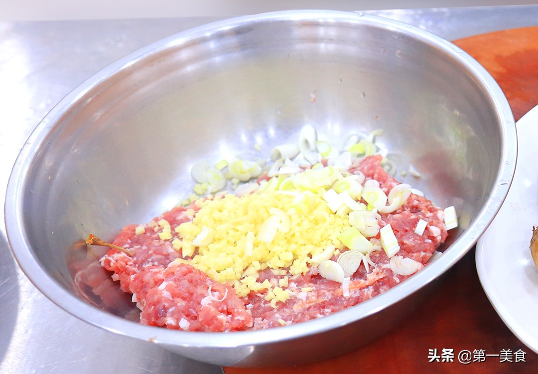 准备大葱一段,从中间划开切成葱花,放在肉馅里。