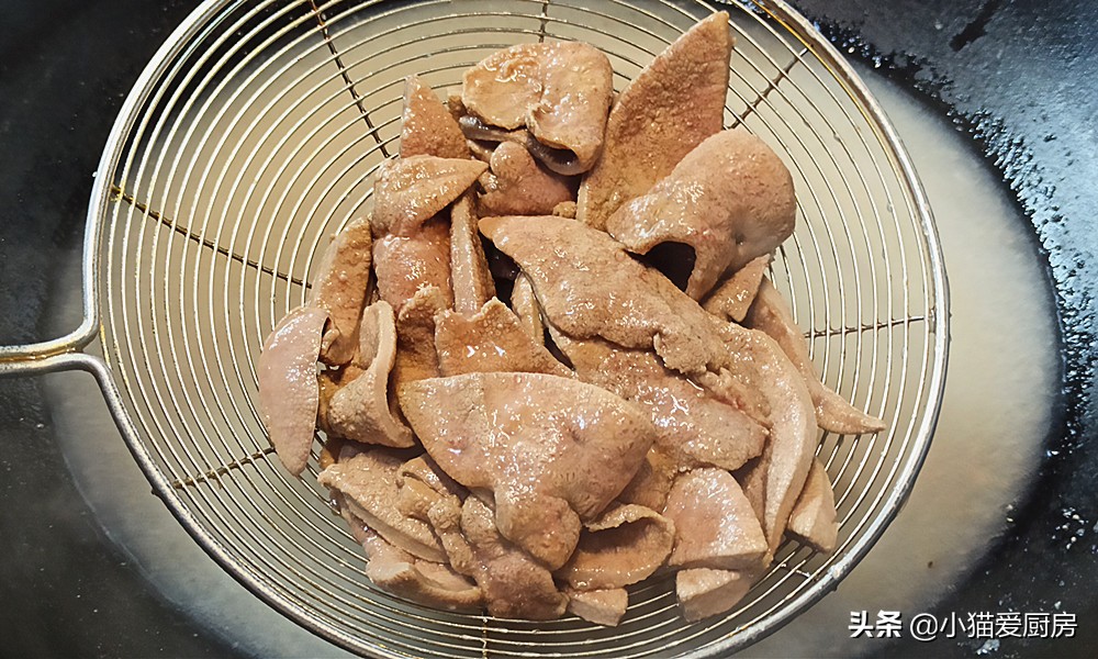 (4)猪肝要先腌制入味,然后炝烫一下,但是不要过火,一般2-3秒钟就好,一般烫定型用以去除血沫和减少腥味。