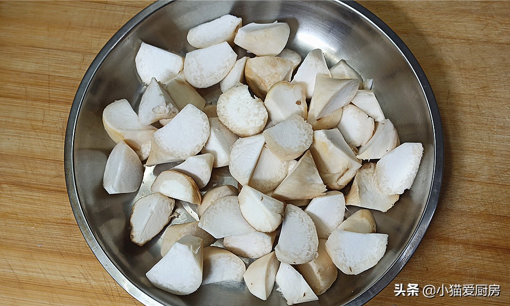 【步骤一】:把杏鲍菇清洗干净切成滚刀块,大小差不多2-3厘米左右。