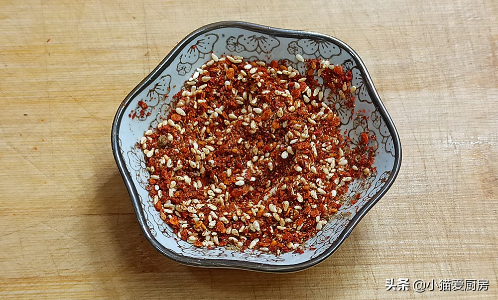 【步骤四】:取一个小碟子,放入辣椒面1勺、孜然粉1勺、盐半勺、熟芝麻1勺,搅拌均匀兑现椒盐面,这里要说明一下,辣椒面和孜然面最好用微波炉打一下,把辣椒面和孜然面的香气烘出来,白芝麻要炒熟。
