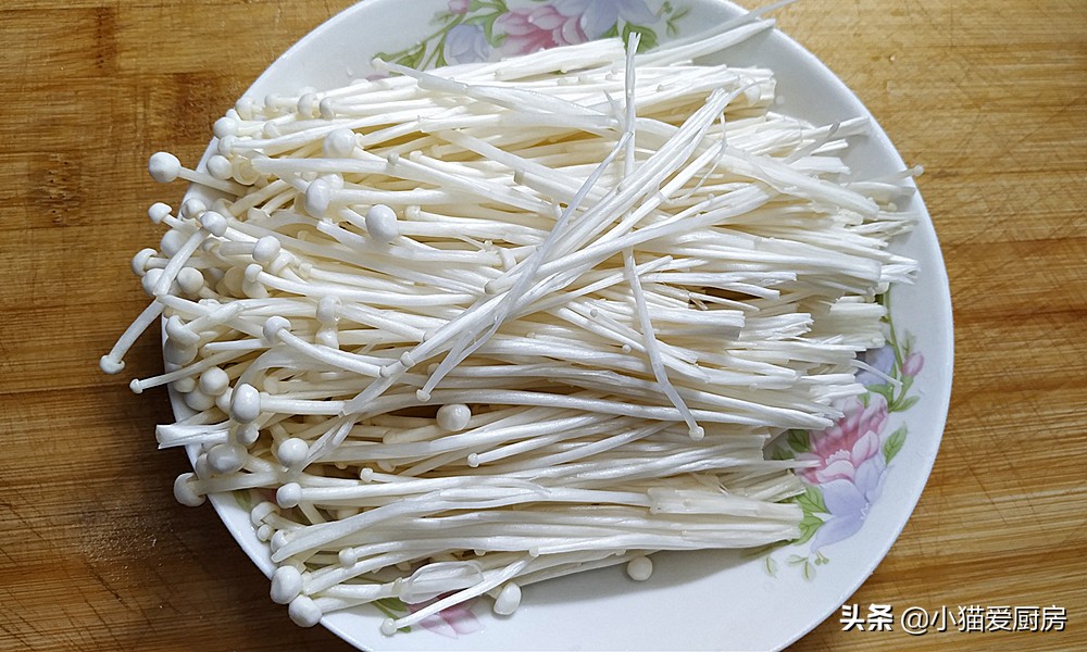 【步骤三】:把金针菇切掉老根,撕开后清洗干净把水沥干装盘备用。